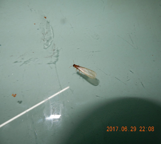 有翅型生殖蟻(俗稱:大水蟻)俗稱大水蟻在每年5~6月份雨後黃昏之際為白蟻生殖蟻羽化飛出之時間,由於白蟻有翅型生殖蟻有正趨光性,一般較常見戶外路燈下大量有翅生殖蟻飛翔盤旋並雌、雄會進行交尾,後其雌蟲翅膀脫落,積極尋找合適繁殖之位置進行生殖工作,得以開始建構蟻道蟻巢完成一個有組織性的白蟻活動生態,其有些白蟻生殖蟻是由是室內大量飛出或戶外有翅型生殖蟻飛入屋內,前者情況有可能已遭受白蟻危害且有一定程度之損壞,應盡早防治以免危害面積範圍擴大,後者若是趨室內光源飛入,若其生殖蟻於室內完成交尾後,日後也潛藏著某種危害的風險!